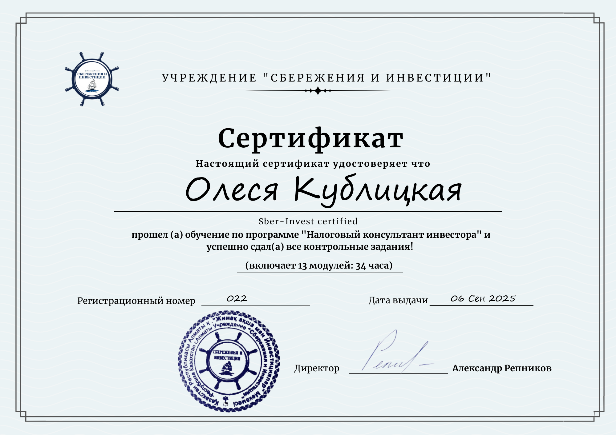 Выдаётся сертификат Sber-Invest.kz. Преподаватели — члены профильных организаций, однако государственного диплома это не заменяет.